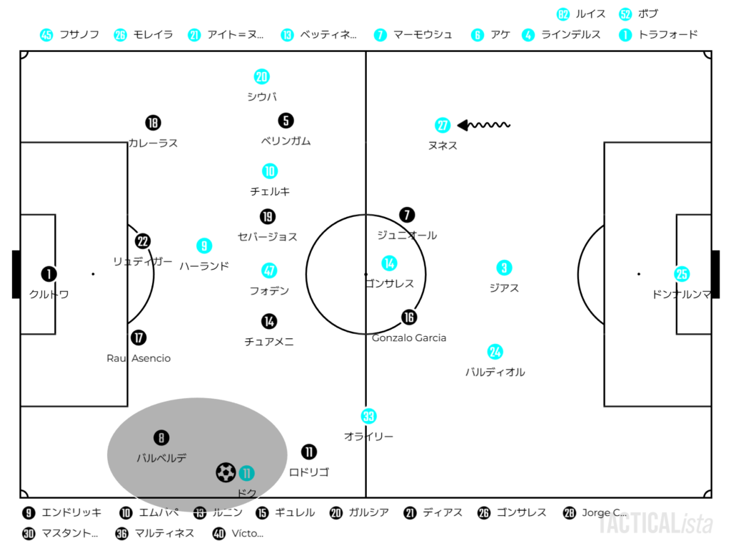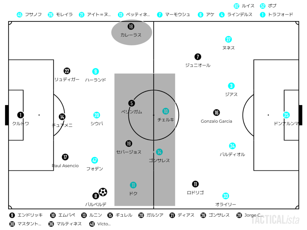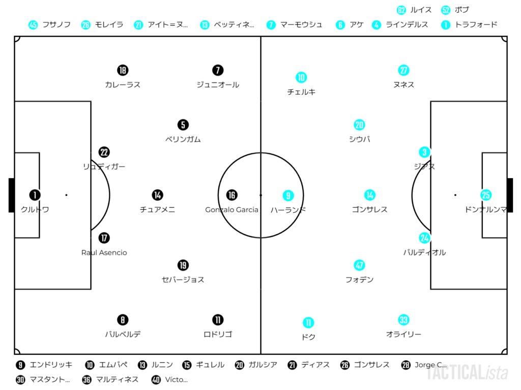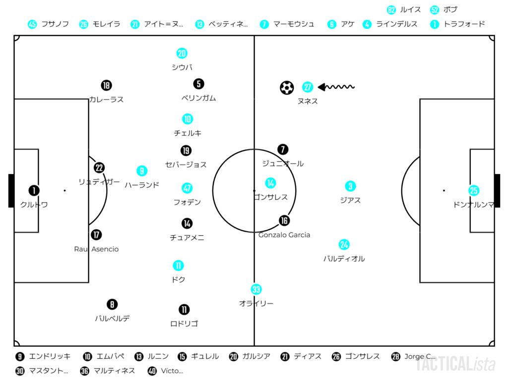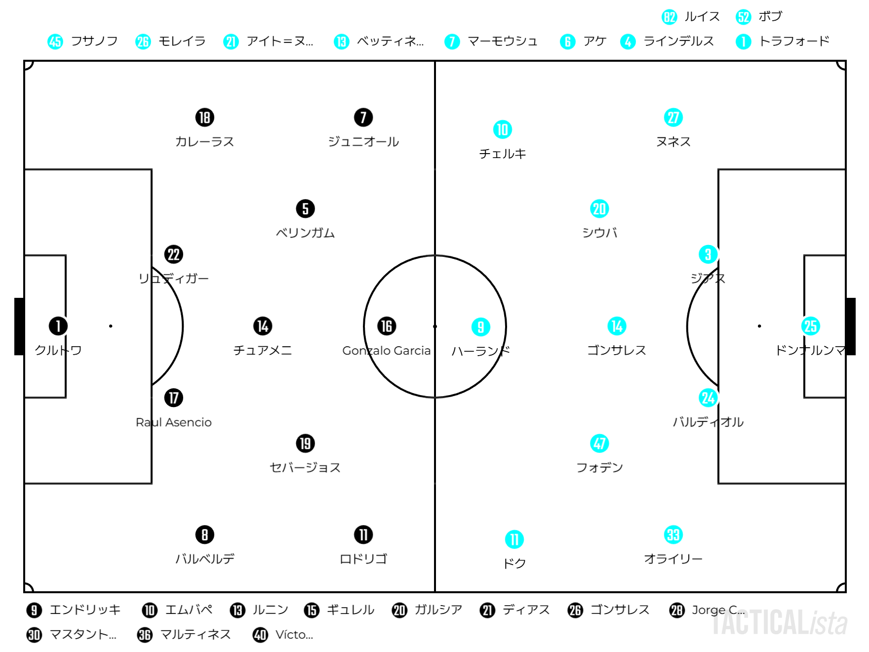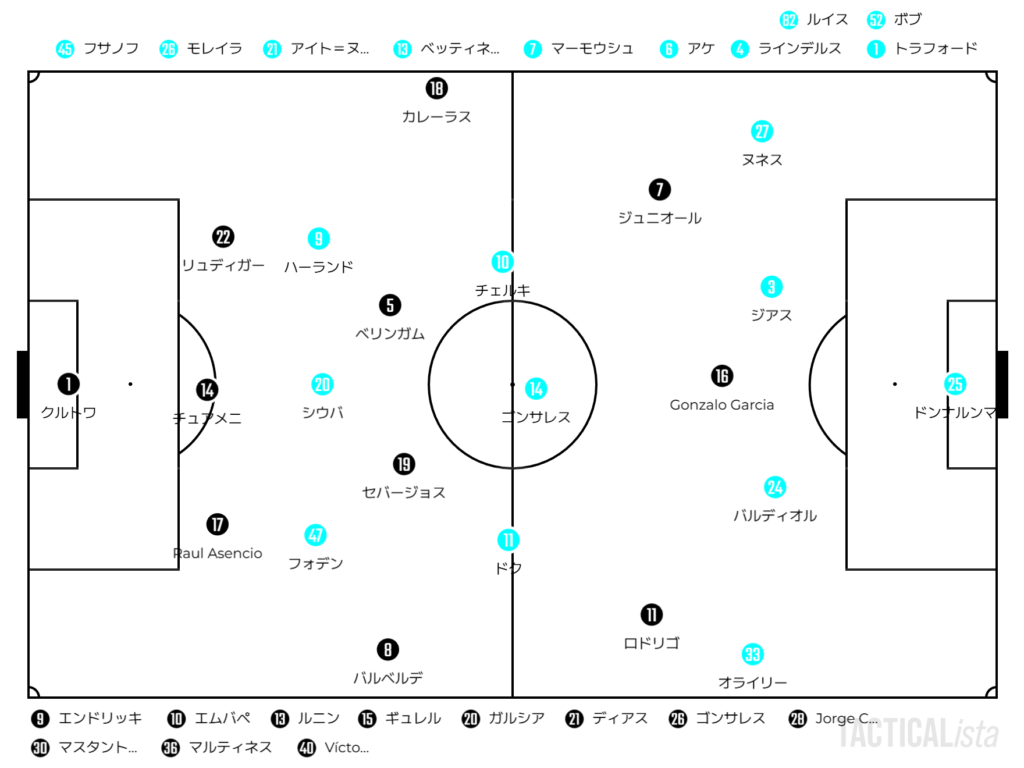 「ヴィニシウスのヘディング、コーナーキックからのヴィニシウスのボレー、エンドリッキのヘディングと繰り返される中央突破もあわせてマンチェスター・シティを苦しめていた」